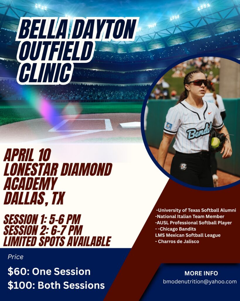 Lone Star Diamond Academy is proud to welcome Bella Dayton to our facility April 10th. She will be hosting 2 clinics – 5-6pm and 6-7pm.